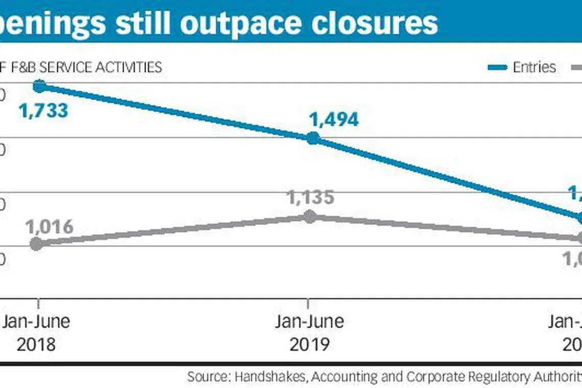 Between January and June, there was a net increase of 96 active entities in F&B service activities, which include restaurants, cafes, food caterers, food kiosks and bars. This is as 1,132 firms joined the sector while 1,036 were deregistered, according to data analysis firm Handshakes, studying data from the Accounting and Corporate Regulatory Authority (Acra).