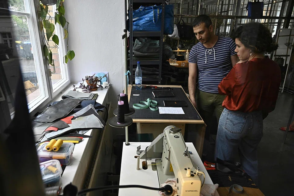 LEANING over his sewing machine in the workshop of the small Berlin-based company called mimycri, Khaldoun Alhussain concentrates as he stitches a piece of grey rubber.