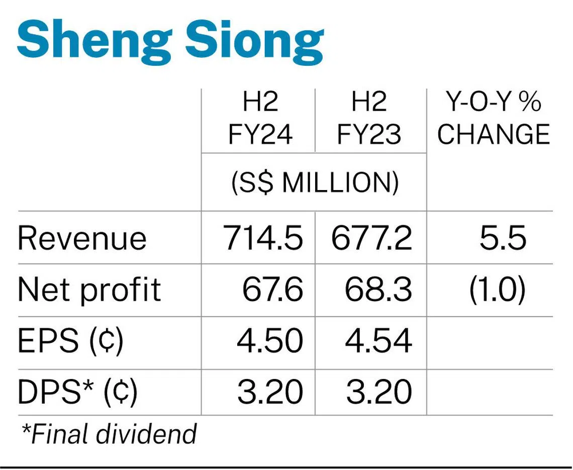 SUPERMARKET operator Sheng Siong delivered a 1 per cent lower year-on-year net profit of S$67.6 million for the second half of the 2024 financial year ended December, as increases in finance and administrative expenses outstripped the rise in revenue.