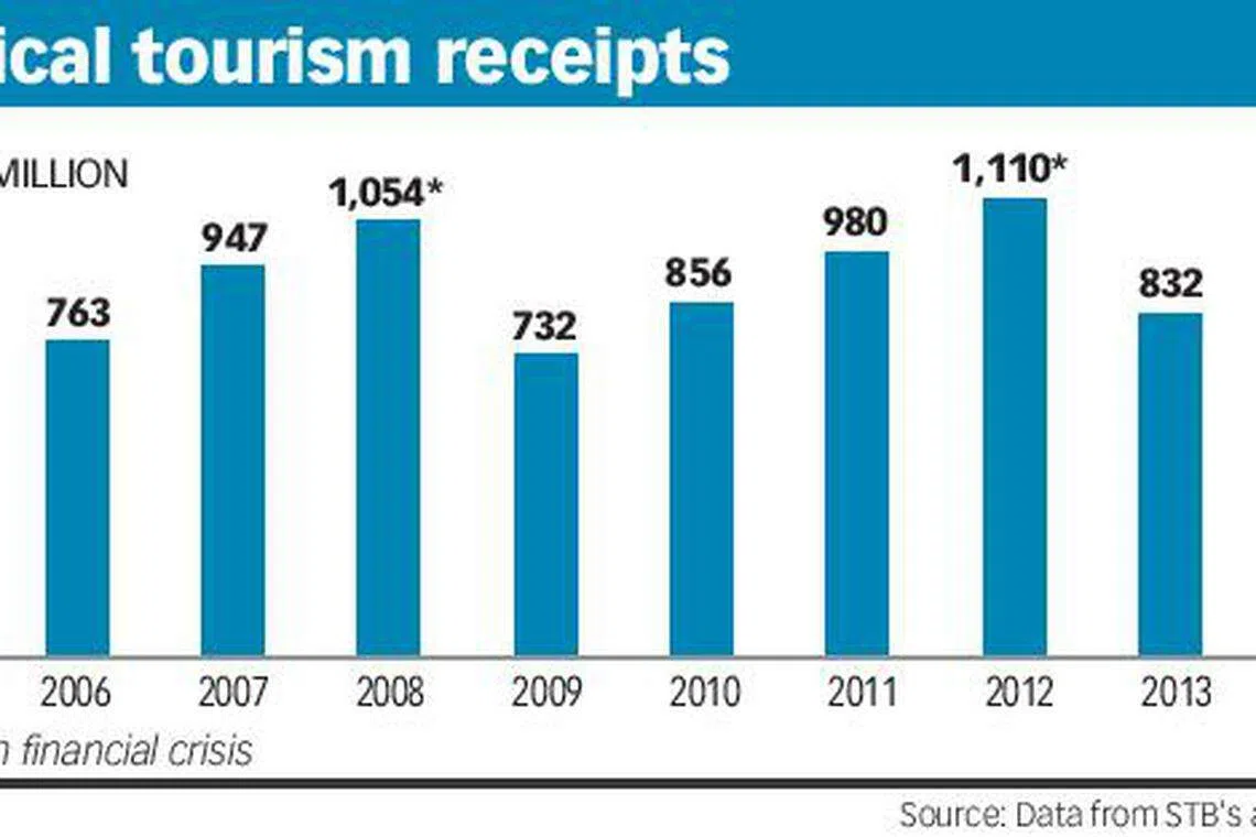 Singapore Tourism Board (STB) figures say that medical tourism receipts stood at S$1.05 billion in 2008, but fell to S$732 million the year after, following the 2008 financial crisis. Then it climbed to S$856 million in 2010, and peaked at S$1.1 billion in 2012.