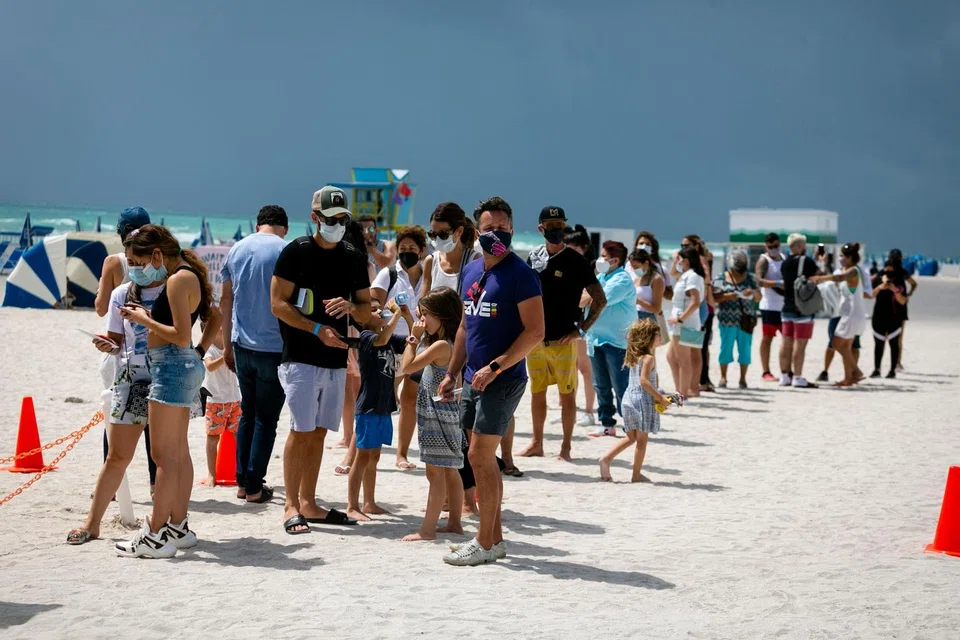 [MIAMI BEACH, United States] A long line of people snaked across the sand of Miami Beach, Florida, as dozens of travellers from Latin America waited their turn at a pop-up coronavirus vaccination booth.