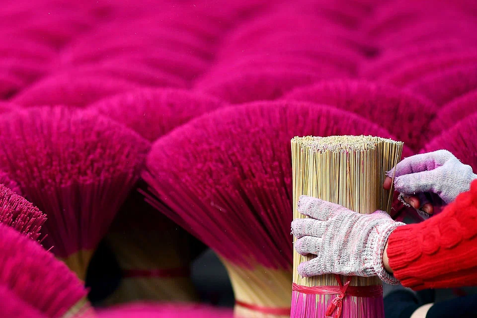 It is the most frantic time of year for workers in the cottage industry in Quang Phu Cau village on the outskirts of Hanoi, where families have been making incense for more than a century - a great source of pride for many.
