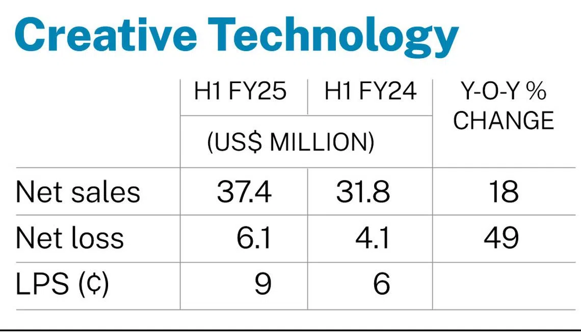 HOME-GROWN electronics company Creative Technology saw its net loss widen to US$6.1 million for its first half of the year ended Dec 31, 2024, from US$4.1 million in the corresponding year-ago period.