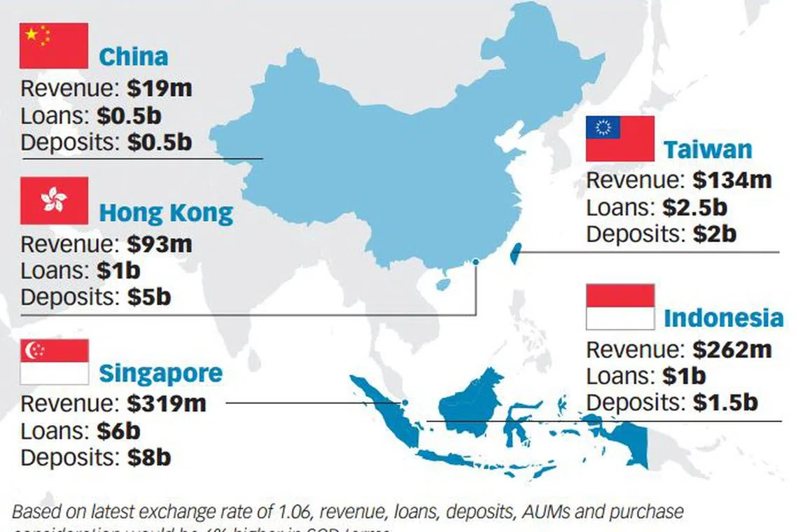 The deal will have DBS take over about 30 branches, mainly in Indonesia and Taiwan. DBS will, in time, "optimise" the network.