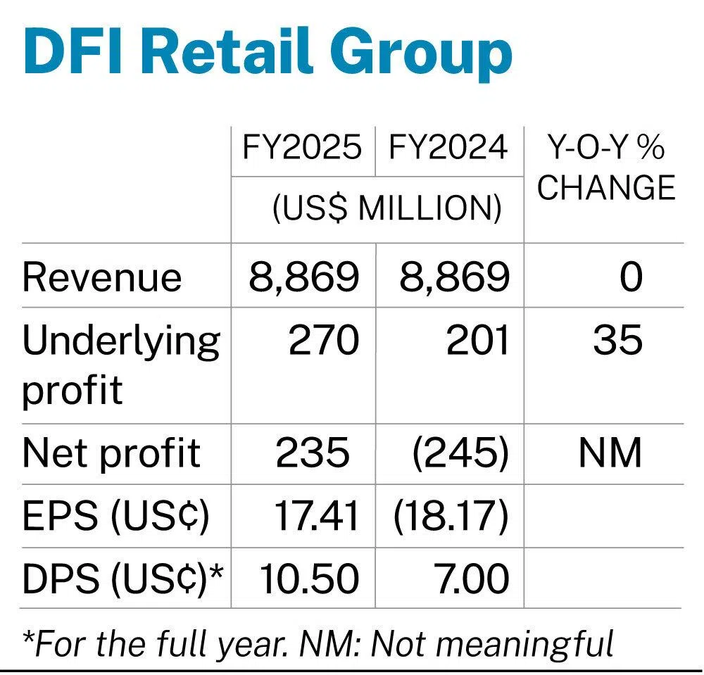 [SINGAPORE] Supermarket and retail store operator DFI Retail Group posted an underlying profit of US$270 million for the year ended Dec 31, 2025, an increase of 35 per cent from US$201 million for the previous financial year.