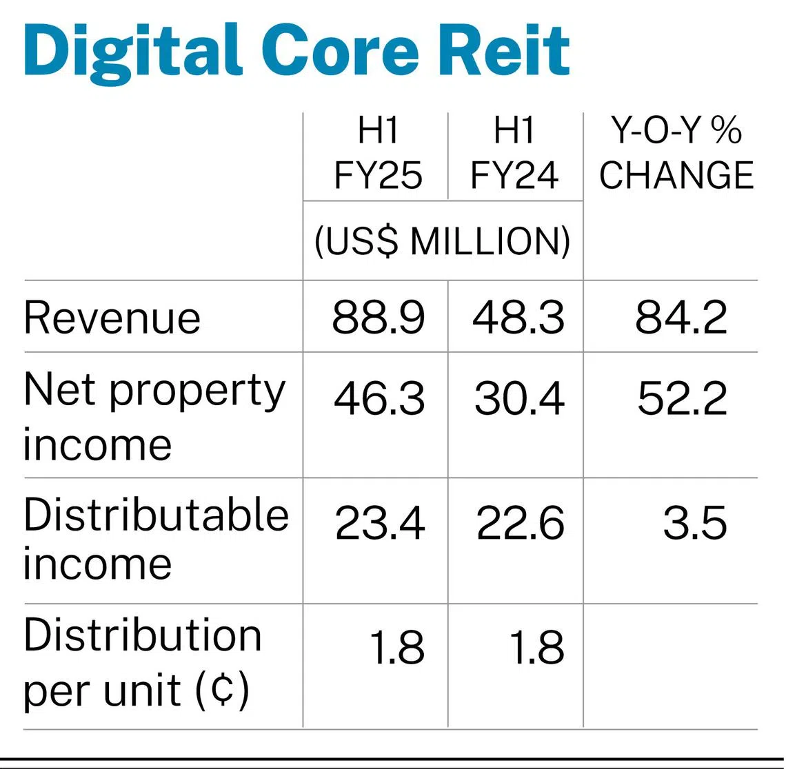 Digital Core Reit’s H1 FY2025 revenue increased 84.2 per cent to US$88.9 million, from US$48.3 million in the year-ago period. Net property income rose 52.2 per cent year on year to US$46.3 million.