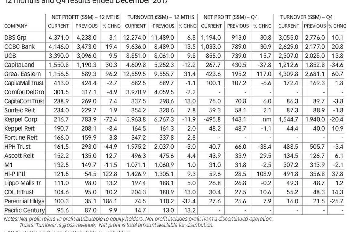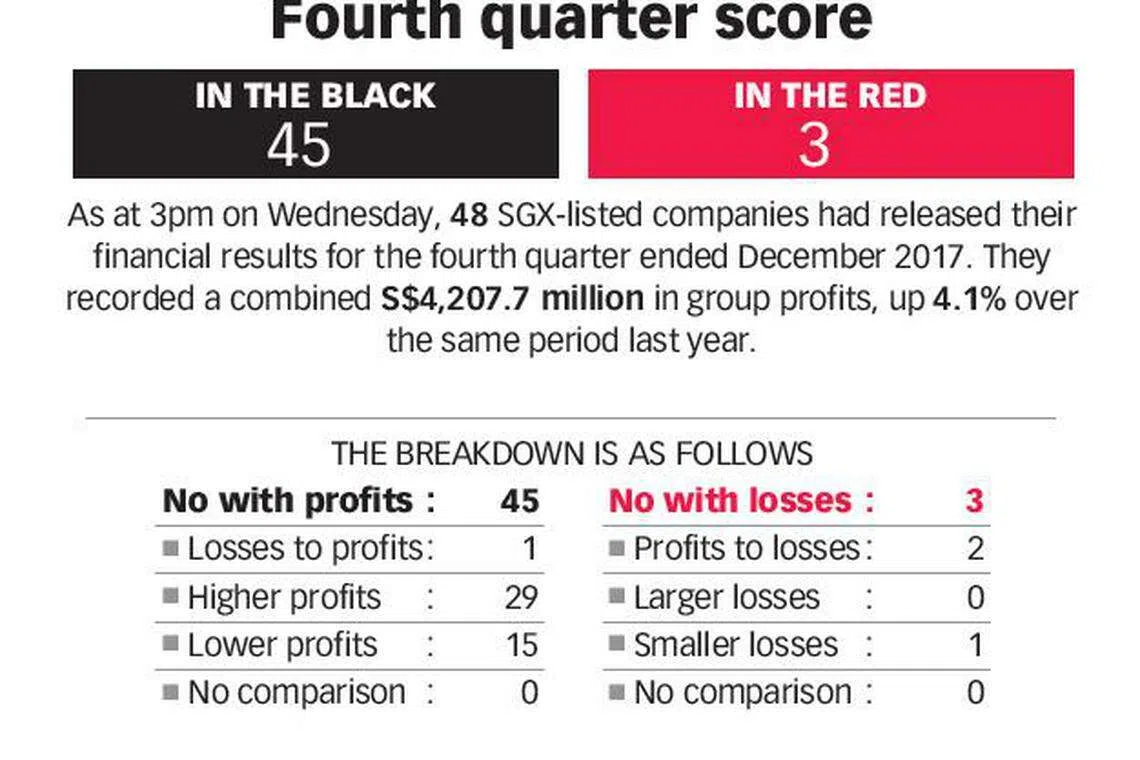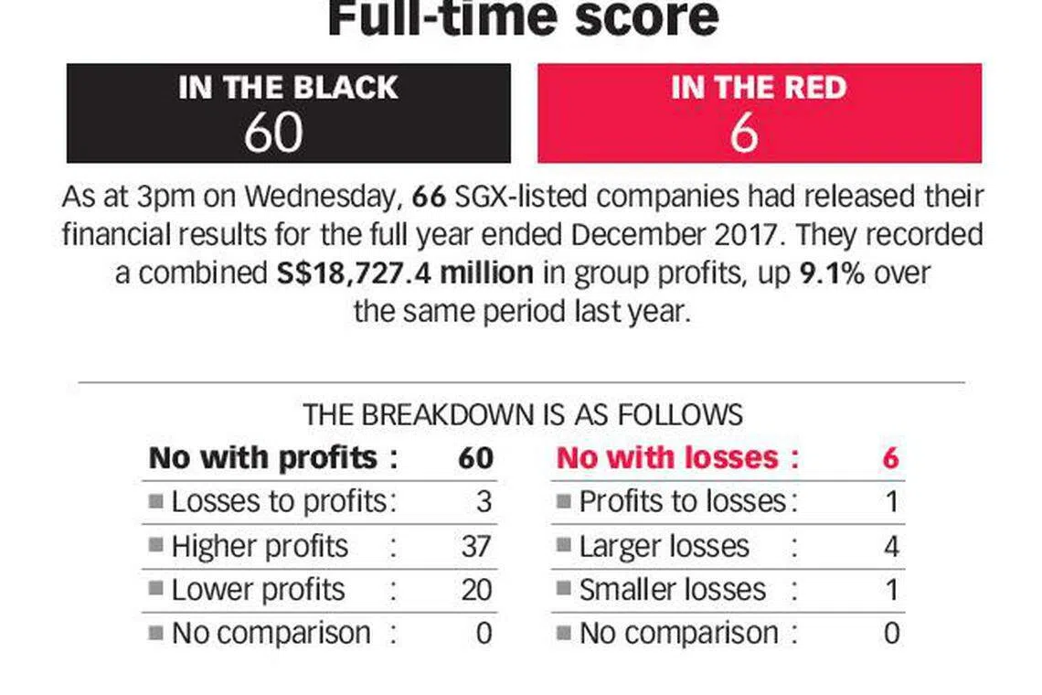 KGI Securities Singapore head of research Joel Ng told The Business Times: "If you listen in to earnings and management discussions, the tone has shifted to positive expectations for 2018 on healthy macro trends. (But) most of the low hanging fruits are gone. We could potentially see higher risk of earnings misses going into the second half this year given the higher base in 2017."