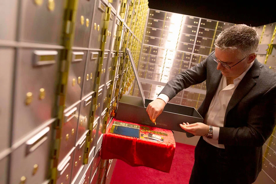 Down an elevator, past a manned security booth and a fingerprint scanner - as well as a hefty metal safe door - is a caged vault, ranked with 3,000 double-locked deposit boxes. Their full contents are known only to clients.