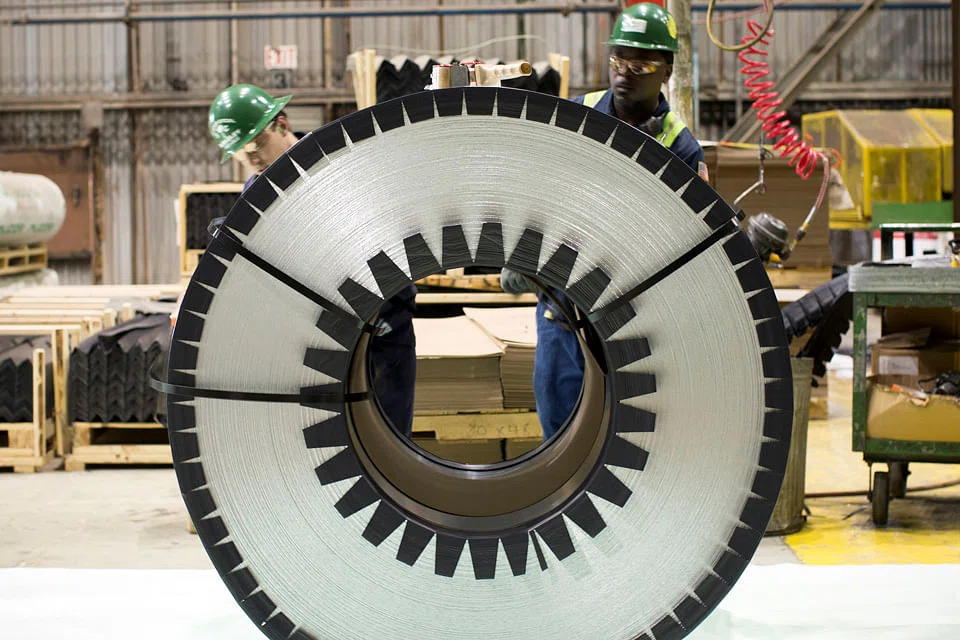 Working the day shift at the sprawling Nucor Steel plant here, Mr St Amand monitors a 1.2 metre wide lasagna noodle of steel as it is dunked into a molten broth of protective shimmering zinc.