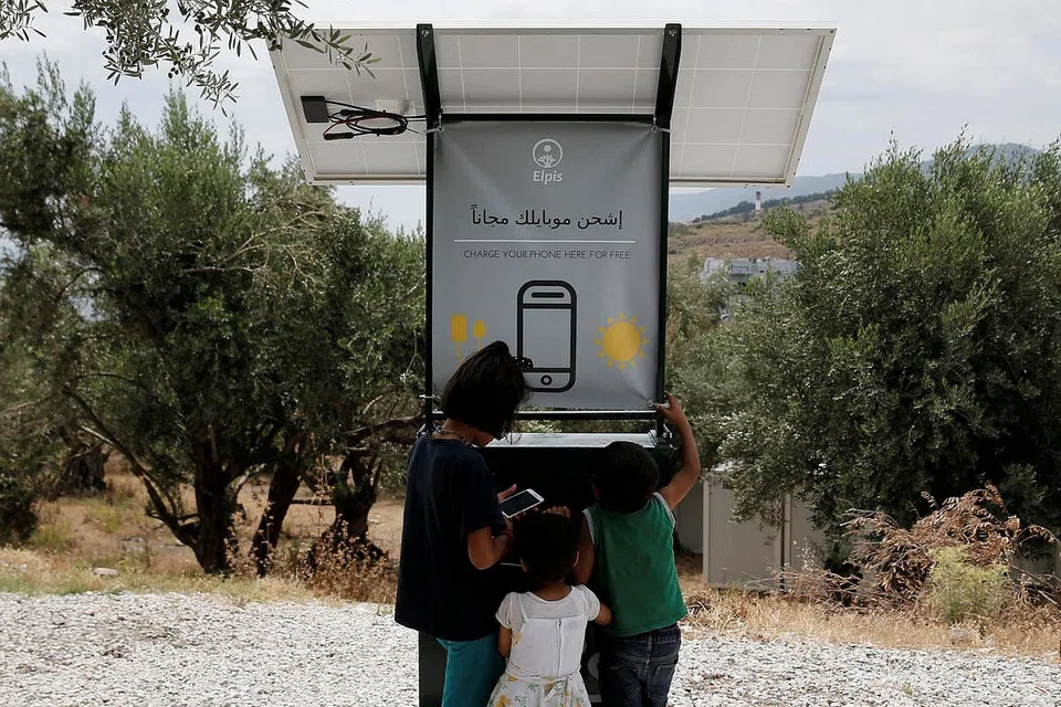 Sun-powered phone charger gives migrants in Greece free electricity