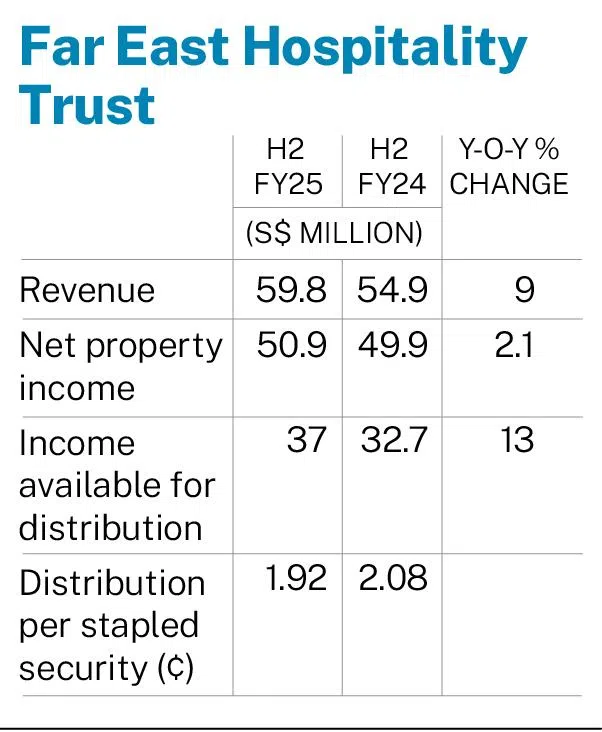 [SINGAPORE] The manager of Far East Hospitality Trust (FEHT) posted a distribution per stapled security (DPS) of S$0.0192 for its second half ended Dec 31, 2025, a 7.7 per cent decline from S$0.0208 in the previous corresponding period.