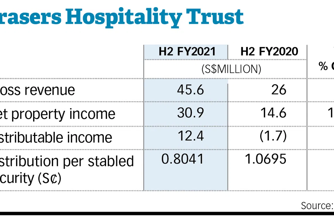 FRASERS Hospitality Trust (FHT) saw its distribution per stapled security (DPS) for the half year ended Sep 30, 2021 fall 24.8 per cent on-year from its H2 FY2020 DPS of S$0.010695, announced managers of the stapled group on Friday (Oct 29).