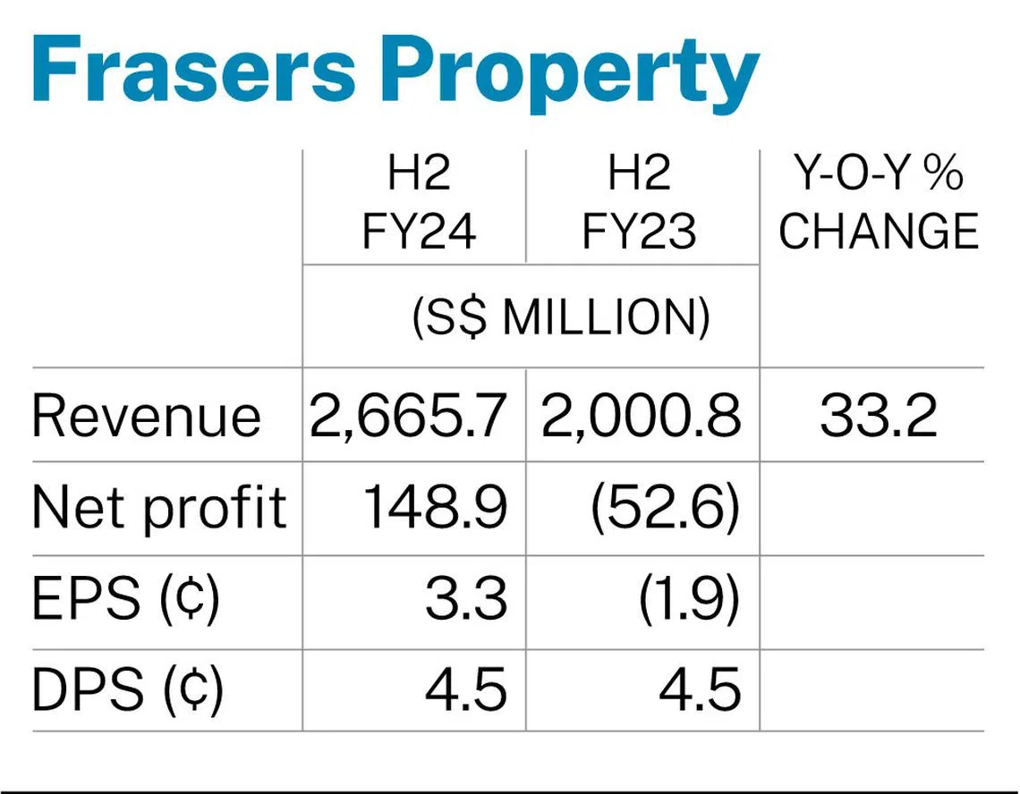 FRASERS Property posted a net profit of S$148.9 million for the second half of its financial year ended Sep 30, reversing losses of S$52.6 million in the same period the prior year.