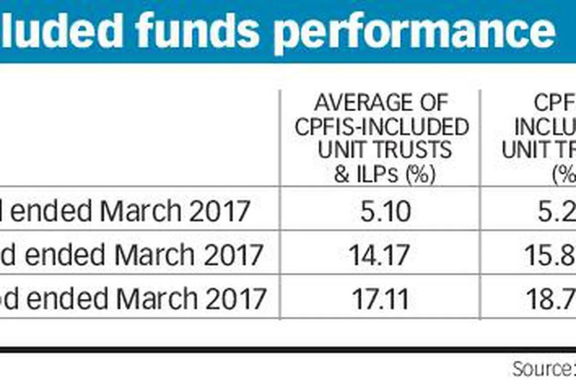 For the three-year period from March 2014 to March 2017, CPFIS-included funds grew by 17.11 per cent on average, accounted for by a gain of 18.71 per cent from CPFIS-included unit trusts and 16.27 per cent from CPFIS-included ILPs.