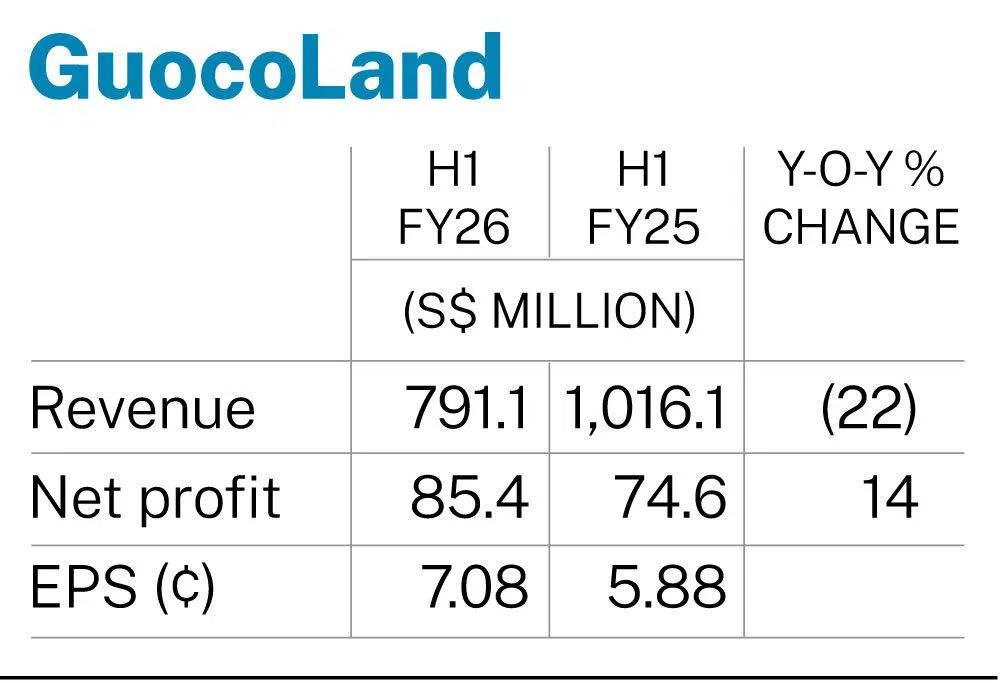 [SINGAPORE] Property developer GuocoLand on Thursday (Jan 29) posted a net profit of S$85.4 million for the six months ended Dec 31, 2025, up 14 per cent from the S$74.6 milllion booked for the previous corresponding period.