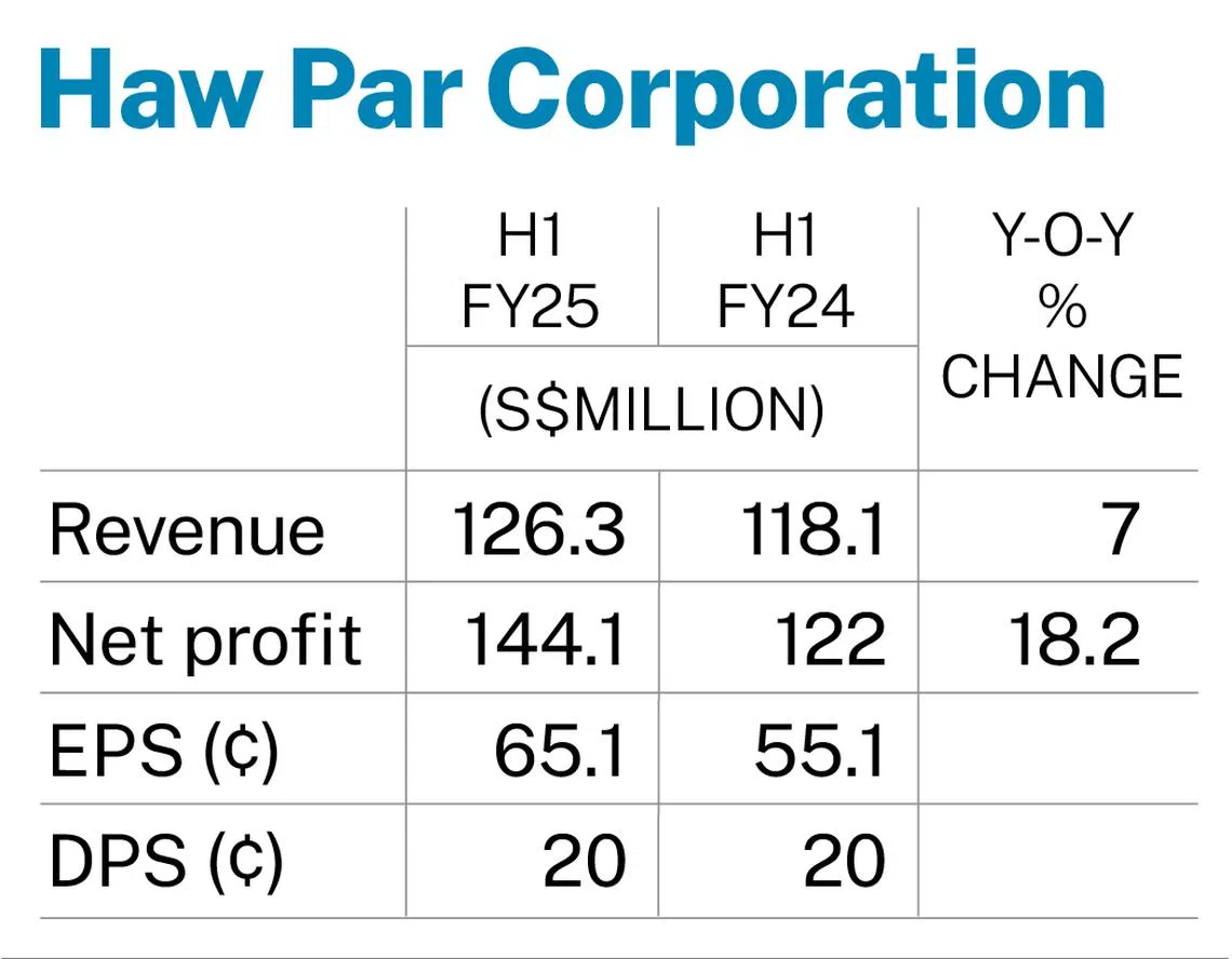 [SINGAPORE] Haw Par Corporation posted an 18.2 per cent rise in net profit to S$144.1 million for its first half ended Jun 30, 2025, from S$122 million in the previous corresponding period.