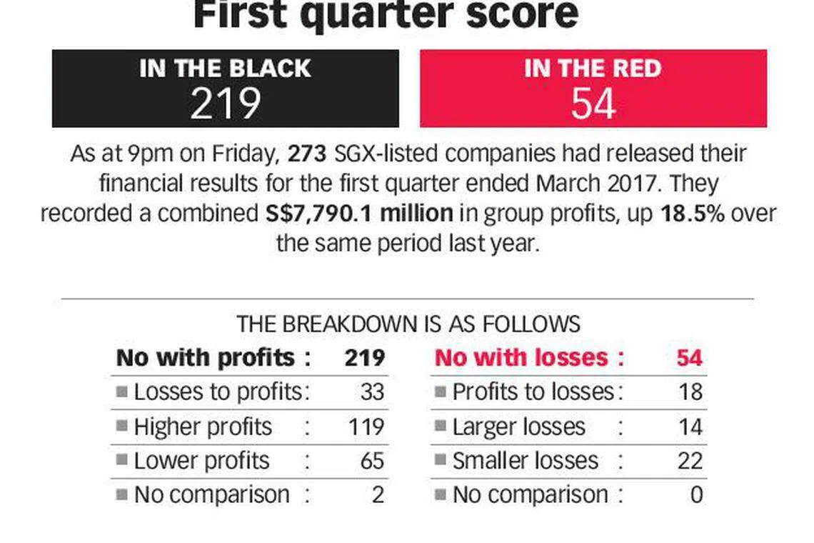 As at 9pm on May 12, 273 Singapore-listed companies whose fiscal years end on Dec 31 had reported a combined S$7.8 billion in first-quarter net profits, up 18.5 per cent year-on-year. Profitable companies outnumbered lossmakers 219 to 54, or about four to one.