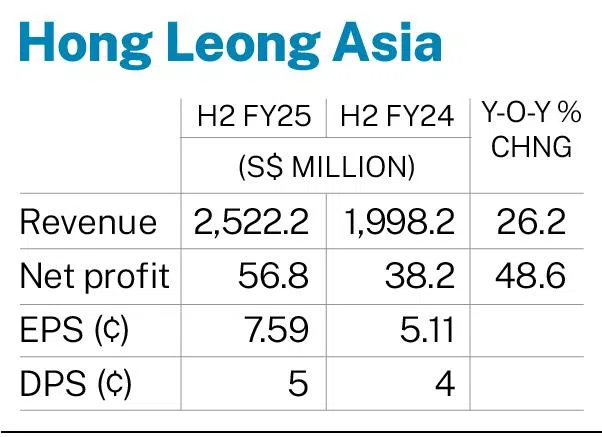 [SINGAPORE] Hong Leong Asia (HLA) on Wednesday (Feb 25) reported a 48.6 per cent surge in net profit for its half-year ended Dec 31, 2025, to S$56.8 million, from S$38.2 million the year before.