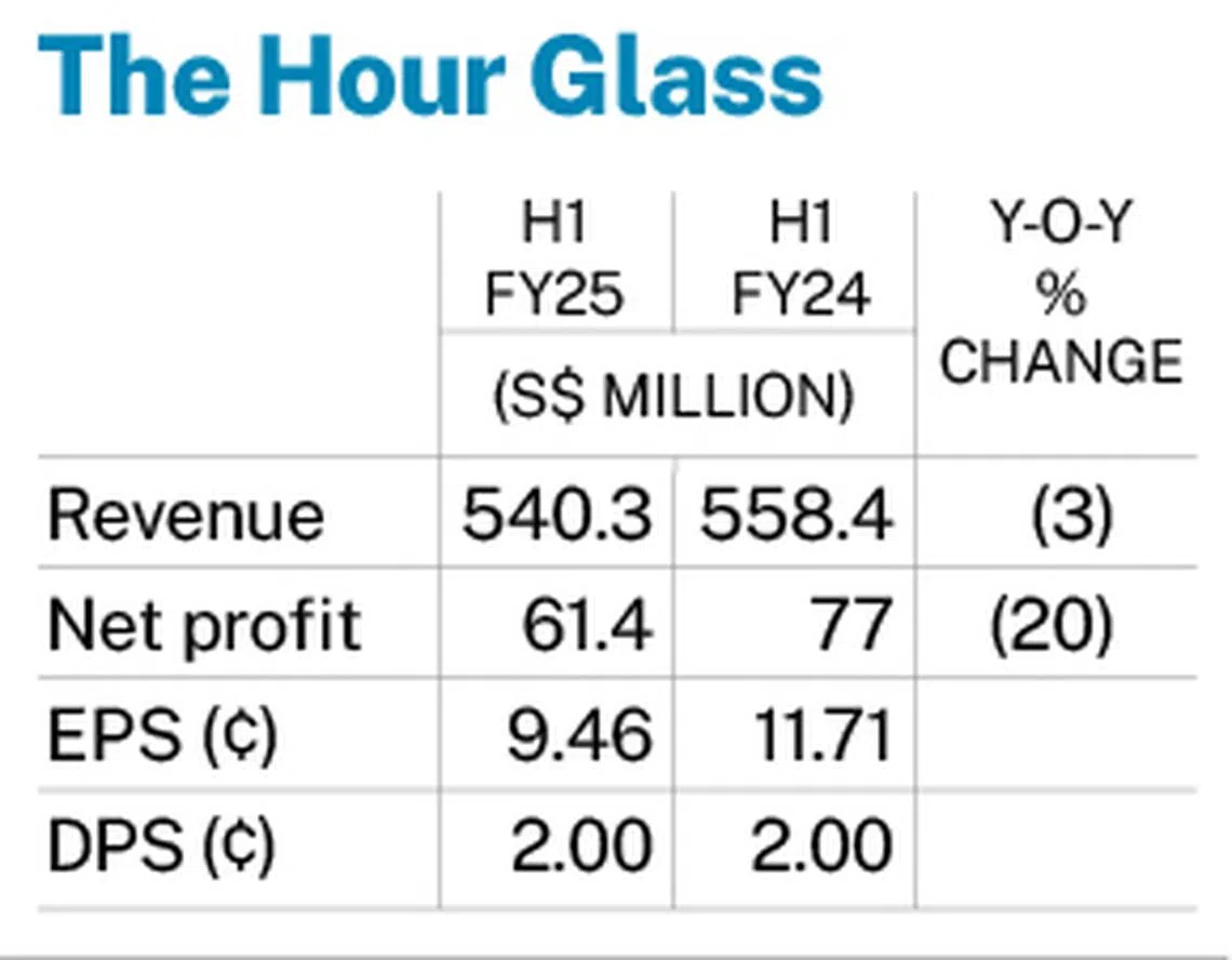 THE Hour Glass posted a 20 per cent fall in earnings to S$61.4 million for the first half of FY2025 ended Sept 30, from S$77 million the year before.