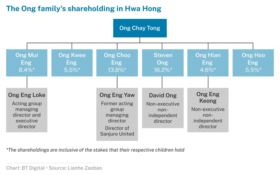 Hwa Hong founder Ong Chay Tong had 2 wives and 6 sons. His sons and their families are all shareholders of Hwa Hong, with their shareholdings as follows: Ong Mui Eng with an 8.4 per cent stake; Ong Kwee Eng with 5.5 per cent; Ong Choo Eng with 13.8 per cent; Steven Ong with 16.2 per cent, Ong Hian Eng with 4.6 per cent; and Ong Hoo Eng with 5.5 per cent.