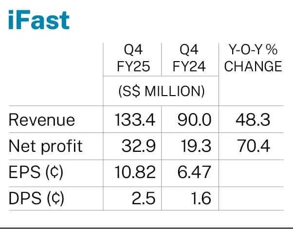 [SINGAPORE] Digital bank and wealth management platform iFast posted a 70.4 per cent rise in net profit to S$32.9 million for the fourth quarter ended Dec 31, 2025, up from S$19.3 million in the corresponding period a year earlier.
