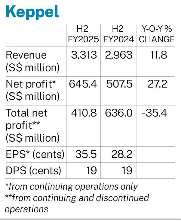[SINGAPORE] Keppel posted a net profit of S$645.4 million from its continuing operations for the second half of the year ended December 2025. This was up 27.2 per cent from S$507.5 million in the previous corresponding period, it said in a bourse filing on Thursday (Feb 5).