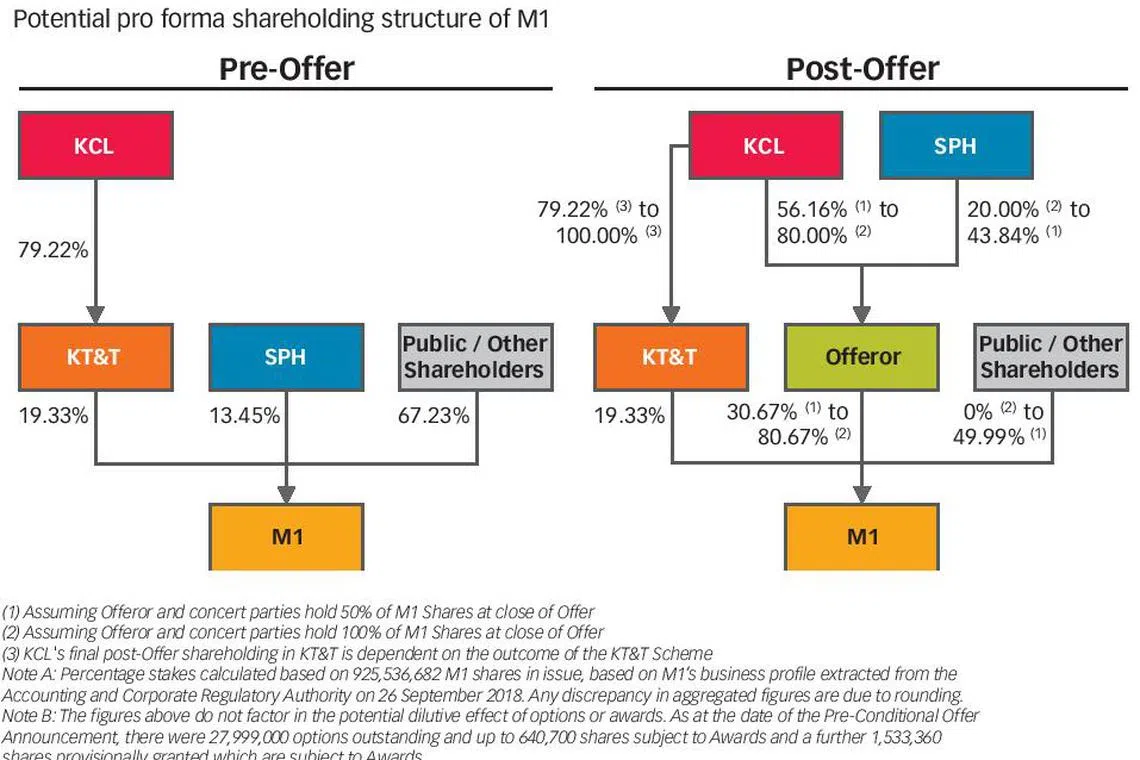 Currently, KepCorp owns 19.3 per cent of M1 through its 79.2 per cent subsidiary Keppel T&T, while SPH has a 13.45 per cent stake. The offer will not be extended to Keppel T&T as it is a related corporation.