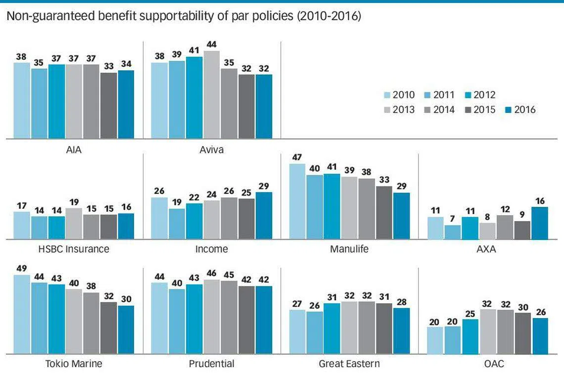 Based on publicly available Singapore data, only two of the 10 - AIA and Prudential - managed to keep their buffers at more than a third of their total Par assets in 2016, down from three a year ago.