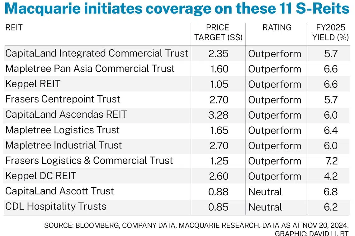 Macquarie analysts Rachel Tan and Jayden Vantarakis said in a November report that the earnings of S-Reits are likely to bottom in fiscal 2025, indicating the same for their distributions per unit (DPU). And if the Fed cuts interest rates by another 25 basis points next month as widely expected, the impact to DPU could range between neutral and a positive 3 per cent.