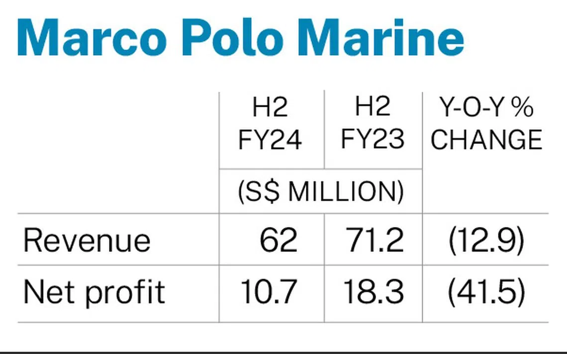 MARCO Polo Marine posted a lower net profit of S$10.7 million for the second half of its financial year ended Sep 30, 2024, down 41.5 per cent from S$18.3 million in the previous corresponding period.