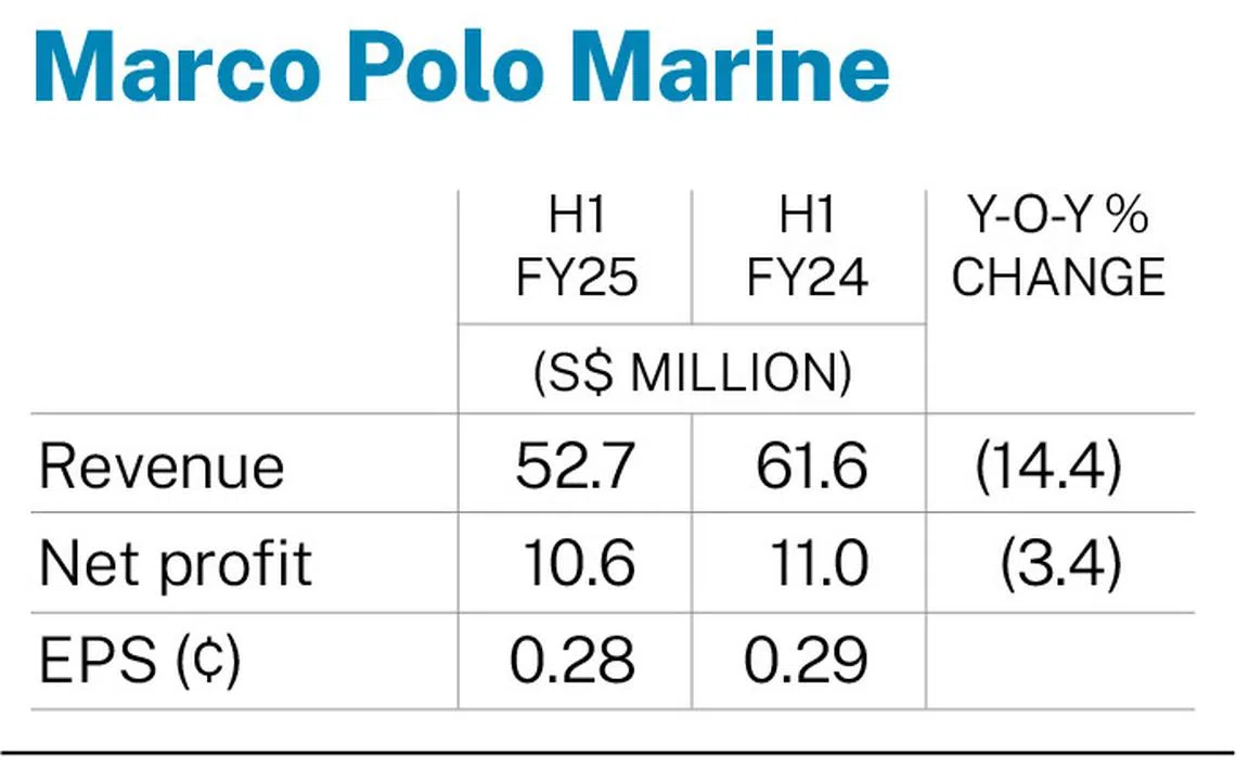 [SINGAPORE] Marco Polo Marine on Friday (May 9) posted a 3.4 per cent year on year decline in H1 net profit to S$10.6 million, from S$11 million.