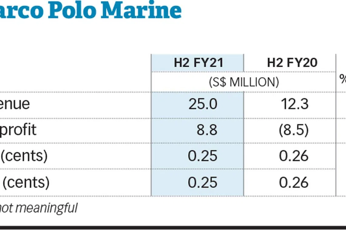 The latest set of H2 financials brings Marco Polo's full-year net profit to S$14.8 million, compared to a net loss of S$9.2 million a year ago. Its FY2021 revenue was up 49 per cent on-year to S$46.1 million from S$30.8 million the previous year.