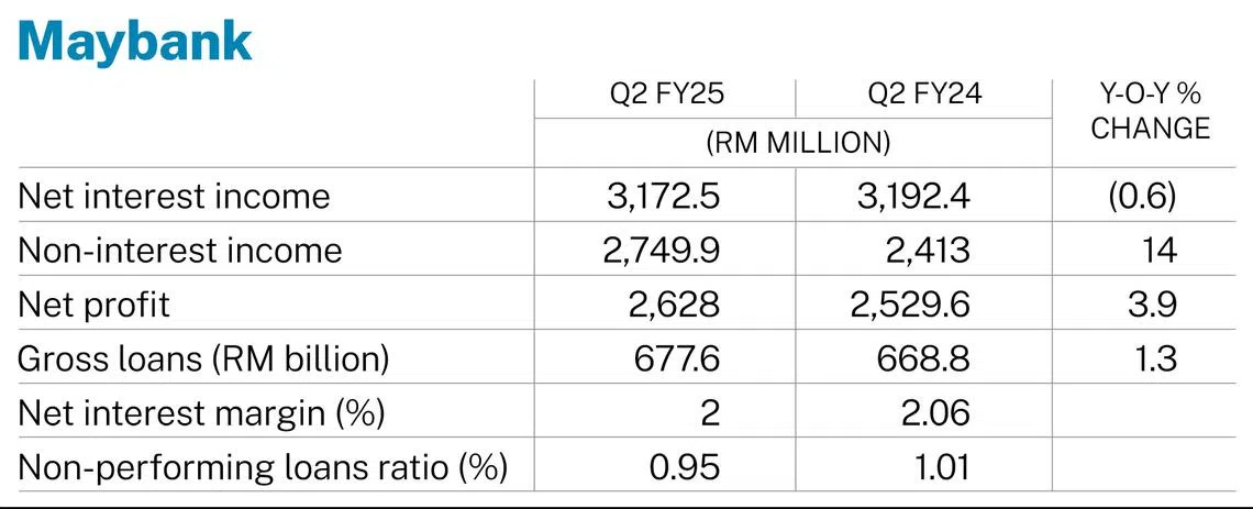 [SINGAPORE] Maybank posted on Tuesday (Aug 26) a 3.9 per cent increase in net profit to RM2.63 billion (S$802.2 million) for the three months ended Jun 30, 2025, from RM2.53 billion for the previous corresponding period.