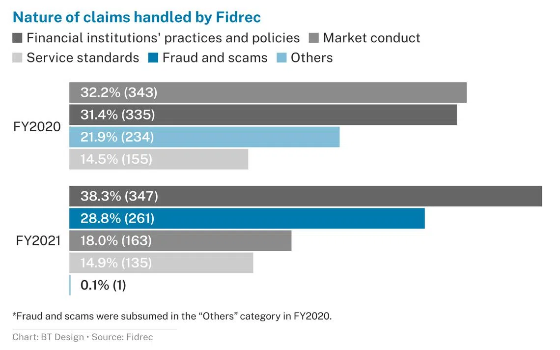 Fidrec, which specialises in the resolution of consumer financial disputes, handled a total of 907 claims in FY2021. Of these, 28.8 per cent involved fraud and scams, up from 22 per cent the year before, it reported on Thursday (Nov 24).