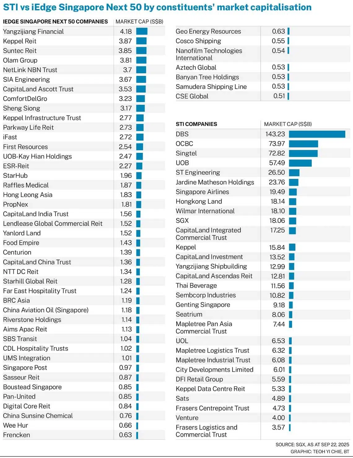 Unveiled on Monday (Sep 22), these benchmarks track the performance of the 50 largest and most liquid mainboard-listed companies that fall outside the Straits Times Index (STI).