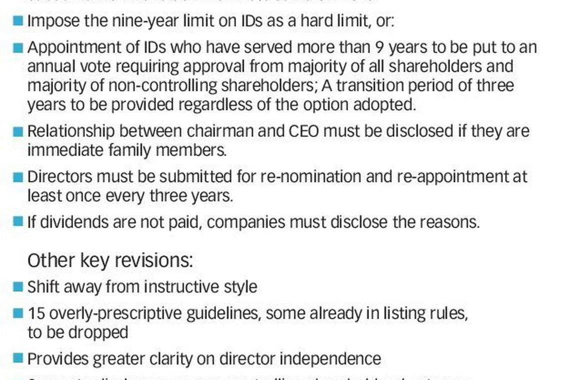 The nine-year rule is just one of 12 other "baseline" market practices that the Council wants to add to the SGX Listing Rules for mandatory compliance. Currently, firms are only encouraged to observe these practices under a comply-or-explain regime.