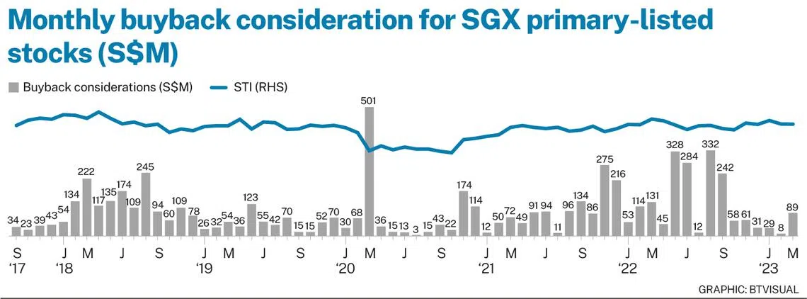 Amendment note: An earlier version of this story said that non-STI stocks that led the buyback consideration tally in Q1 2023 included Keppel Reit, Comba Telecom Systems Holdings, Yangzijiang Financial Holding, Nanofilm Technologies International and Best World International - but did not specify that Comba Telecom’s buyback consideration is in HK dollars as the buybacks were conducted on HKEX.