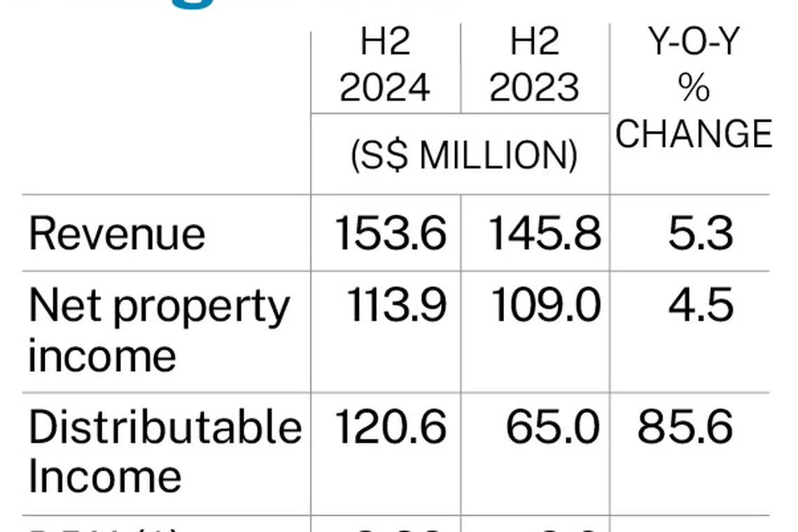Including a special distribution of S$0.0185 that was paid to unitholders in October 2024, DPU for the second half would have risen 60.8 per cent on the year to S$0.0418. DPU for FY2024 would have also been 29.5 per cent higher at S$0.065.