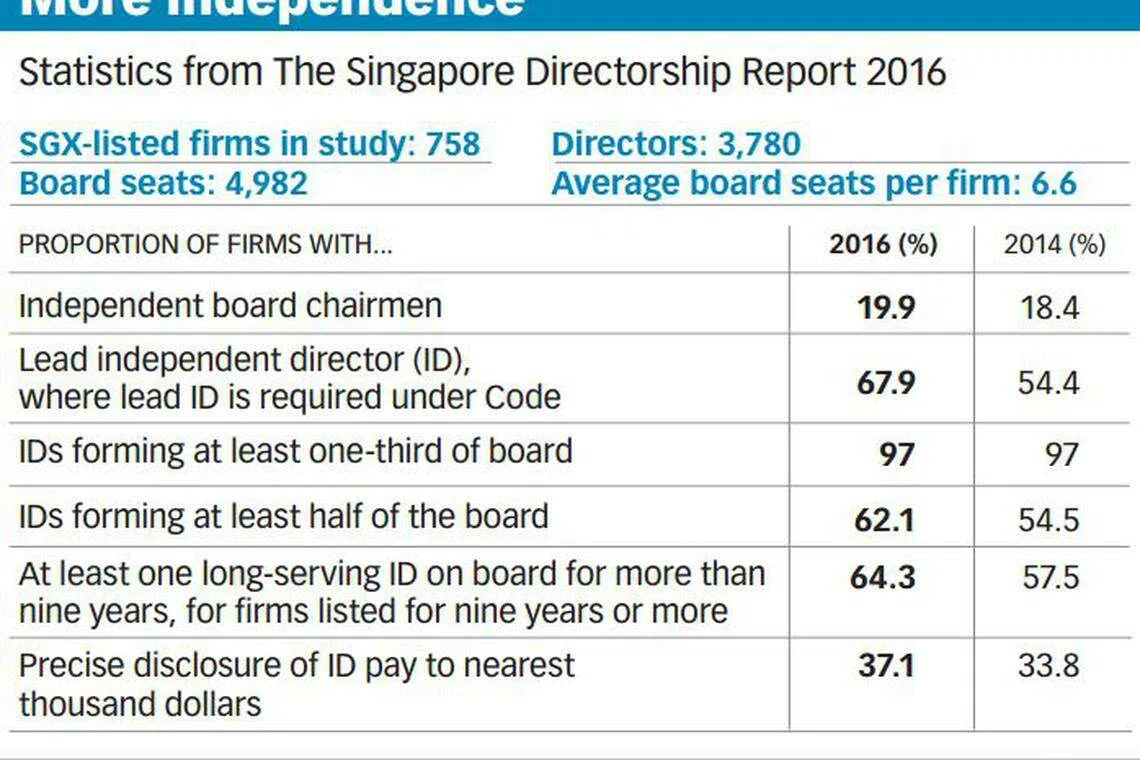 MORE independent directors (IDs) are showing up on the boards of Singapore-listed companies, a comprehensive study released on Tuesday has found.