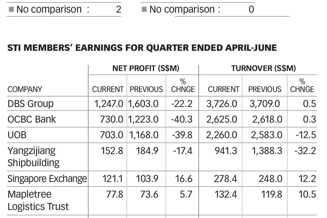 Local lenders and Reits, which together make up the lion's share of the STI, dragged down the total second-quarter income pool for Singapore-listed companies.
