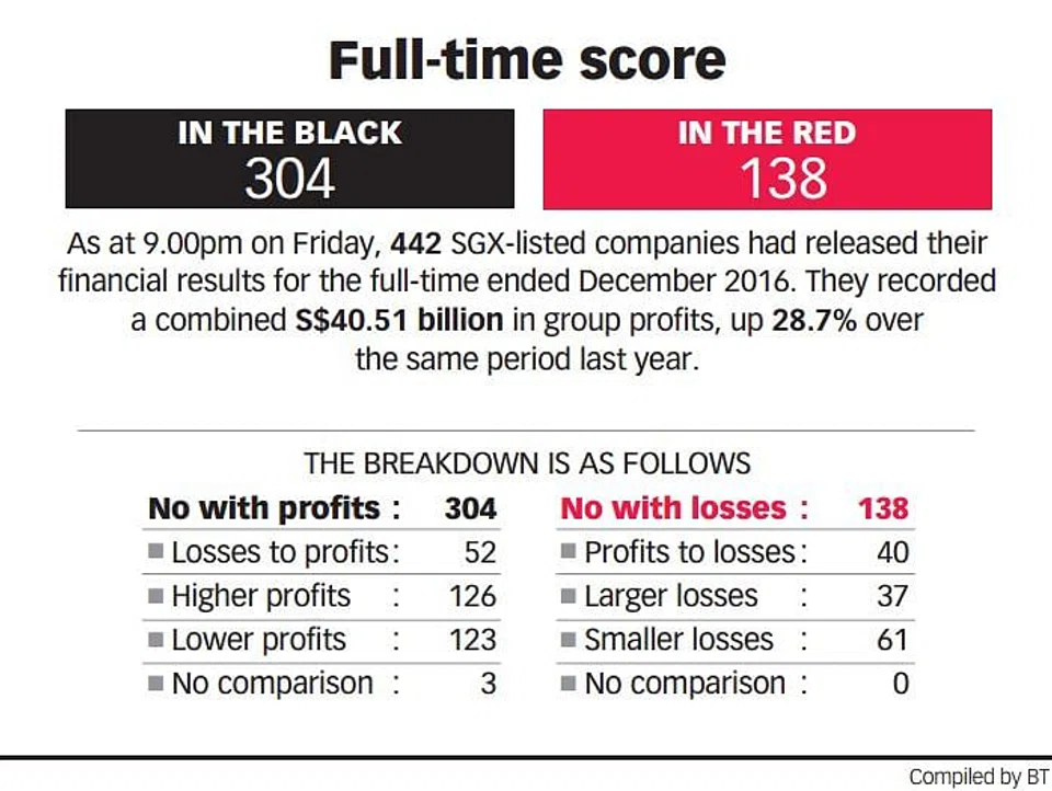 Of the 237 companies with December year-ends that had reported their fourth-quarter results as at 9pm on Friday, 172 posted profits compared to 65 that announced losses, or about eight in the black for every three in the red, according to data compiled by BT.