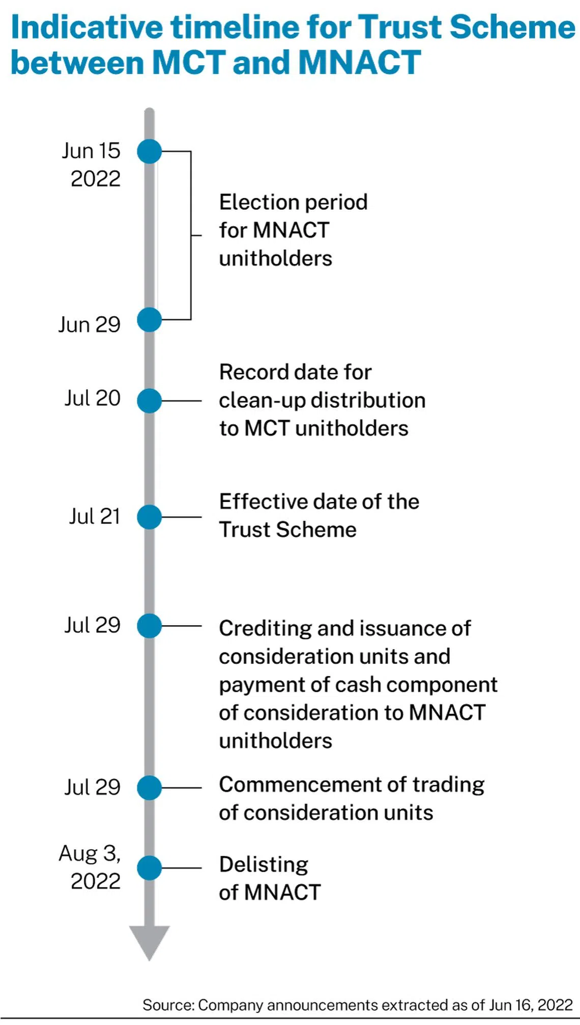 During the election period, each MNACT unitholder is entitled to choose only one form of scheme consideration: scrip-only, cash-and-scrip or cash-only options. The cash-only consideration will be the default form of the scheme consideration.
