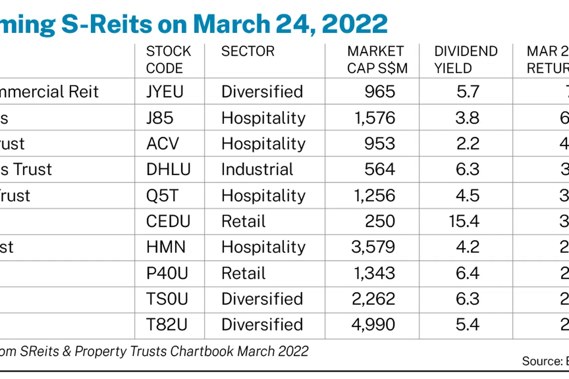 CDL Hospitality Trusts (CDLHT), J85 which owns hotel properties across the Asia-Pacific and Europe, rose 6 per cent over the trading day following the announcement of easing travel restrictions.