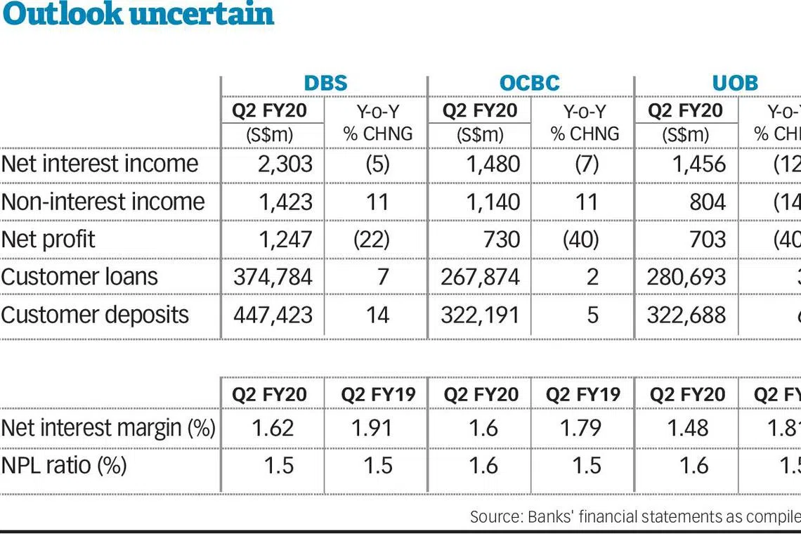 SINGAPORE banks charted a sharp dive in earnings as benchmark rates collapsed in the second quarter and the trio lifted provisions as a buffer against defaults when loan moratoriums unwind at year's end.