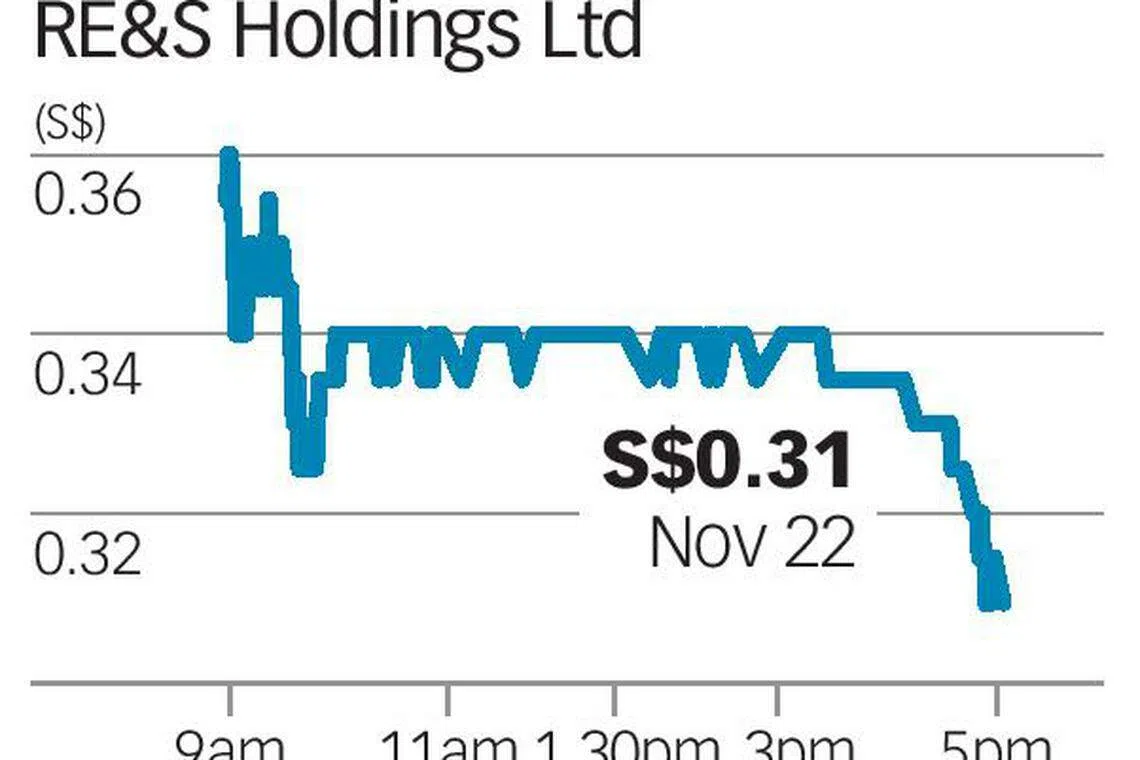 SHARES of RE&S Holdings Limited closed on Wednesday - its first day of trading on the Singapore Exchange's Catalist board - at 31 Singapore cents, 40.9 per cent higher than its issue price of 22 cents.