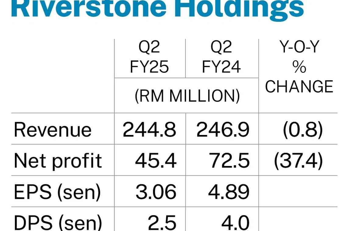 Riverstone Holdings is recommending an interim dividend of 2.5 sen per share for the quarter, down from 4 sen for the year-ago period.