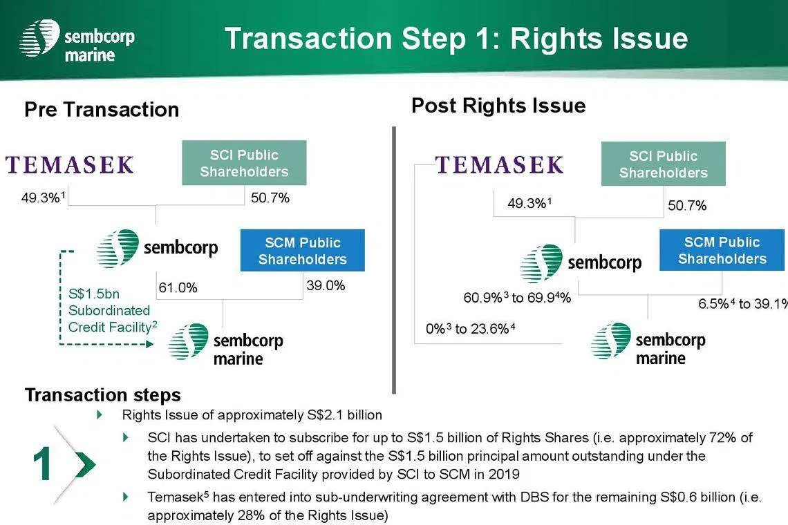 Sembcorp said it plans to do this by setting off a S$1.5 billion subordinated loan that it had extended to Sembmarine in June 2019. Temasek Holdings has agreed to sub-underwrite the remaining S$600 million of the rights issue.