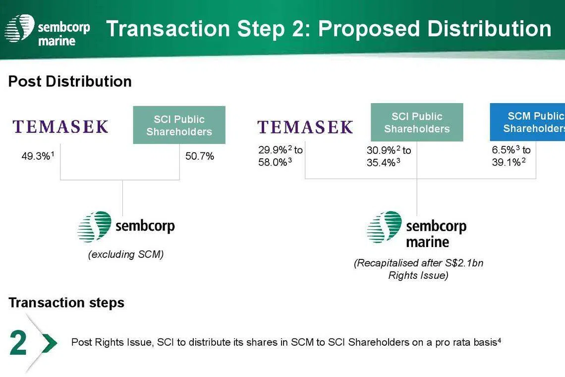 The proposed demerger will be done through a distribution in specie of Sembcorp's stake in the recapitalised Sembmarine to Sembcorp shareholders as dividends. Shareholders of Sembcorp are set to receive between 427 and 491 Sembmarine shares for every 100 Sembcorp shares without any cash outlay.