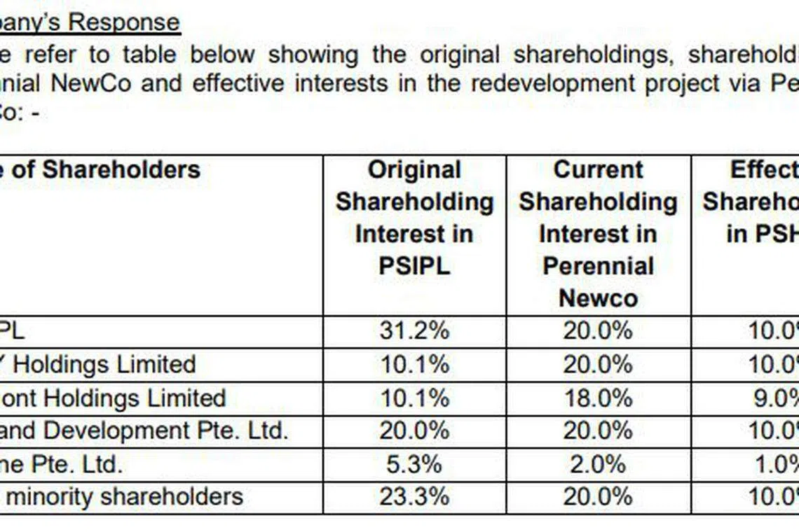 Asked by SGX about the rationale for the formation of NewCo, Perennial said NewCo was formed to address the changes in shareholding proportions, as the existing consortium's shareholders have different risk appetites and investment limits to invest in the redevelopment project.