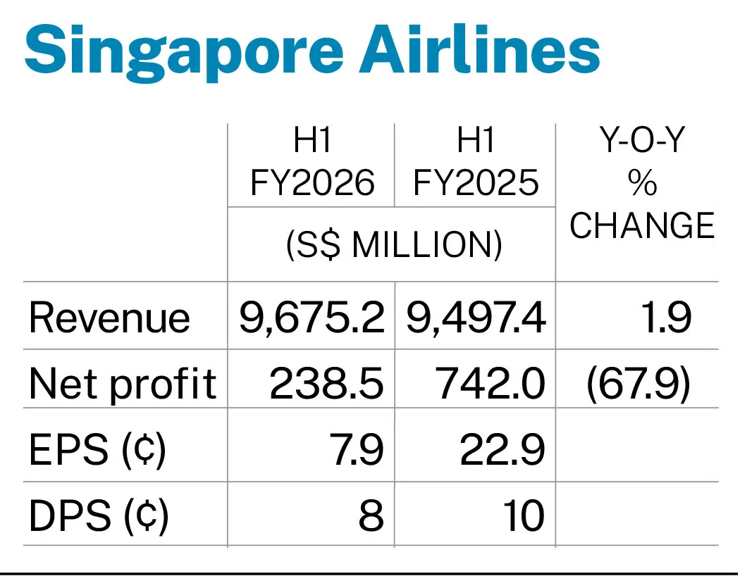 For the first half of FY2026 ended September, SIA posted a 67.9 per cent drop in net profit to S$238.5 million, down from S$742 million in the year-ago period.